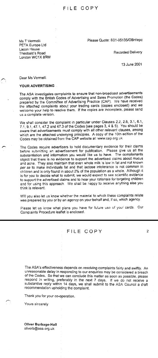 PETA's correspondence with the ASA On 13 June 2001, the ASA contacted PETA about a complaint . The complaint itself is confidential, but in the ASA cover letter, PETA was informed that the NFU and Dairy Council claim that there is no evidence of a link between dairy product consumption and phlegm and acne and that whole milk (which is 50 per cent fat) is low in fat. Click here to learn more about the Advertising Standards Authority (full code is online). PETA replied , fully defending the Milk Suckers cards against the complainants and showing conclusively that milk consumption is linked to phlegm, wind, spots and obesity. Clearly, milk consumption is linked to phlegm , wind , spots and obesity , as well as to heart disease , prostate cancer , breast cancer and many other ailments . The ASA sent a preview of its draft recommendation, which is confidential but which changed the burden significantly. Whilst the original complaint claimed that there was no link between milk consumption and the illnesses depicted on the cards, the new version required PETA to prove that most children will suffer from all the ailments if they consume any milk at all. On 3 August 2001, PETA replied , taking issue with the ASA's changing burden of proof and showing that milk consumption is in fact very likely to cause most children severe short-term and long-term problems, as it is linked to all the illnesses shown in the cards, as well as to long-term illnesses such as heart disease and cancer. In its reply, PETA cited world-renowned paediatrician Dr Benjamin Spock, former Johns Hopkins Director of Paediatrics Dr Frank Oski and respected paediatrician Dr Charles Attwood, who stated, 'After seeing two generations of my patients suffer with asthma and other allergic reactions to milk, I've come to the conclusionwhich is now shared by many allergiststhat six out of 10 children are allergic to milk protein.' On 28 August 2001, the ASA issued it's finding, which will be posted on its Web site , handing PETA a resounding victory by holding only that the cards were too hyperbolic in their condemnation of milk consumption. Click here for PETA's news release on its victory over the milk pushers.